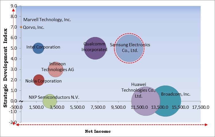 Based on the Analysis presented in the KBV Cardinal matrix; Samsung Electronics Co., Ltd., Huawei Technologies Co., Ltd., and Broadcom, Inc. are the forerunners in the 5G Chipset Market. In June, 2021, Samsung Electronics Co., Ltd. unveiled new 3GPP Rel.16 compliant chipsets for next-gen 5G solutions, including a third-gen mmWave RFIC, second-gen 5G modem SoC, and DFE-RFIC integrated chip. These chips will power Samsung’s 5G products, improving performance, efficiency, and size. Companies such as Qualcomm Incorporated, NXP Semiconductors N.V., and Infineon Technologies AG are some of the key innovators in 5G Chipset Market.