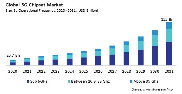 The Global 5G Chipset Market size is expected to reach $155 billion by 2031, rising at a market growth of 19.5% CAGR during the forecast period.