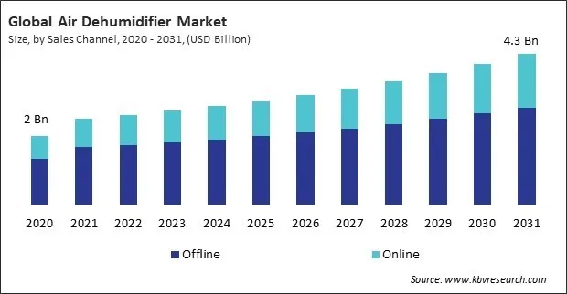 Based on sales channel, the market is fragmented into online and offline. In 2023, the offline segment led the market by generating 66.6% revenue share. Offline retail stores provide immediate availability of air dehumidifiers, allowing consumers to purchase and take home their desired product on the same day. In terms of volume, the offline segment registered 1,003.26 thousand units of sales of Air Dehumidifier in 2023.