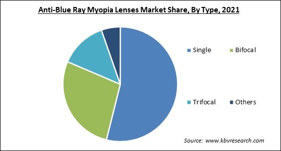 On the basis of type, the anti-blue ray myopia lenses market is segmented into single, bifocal, trifocal and others. The bifocal segment acquired a substantial revenue share in the anti-blue ray market in 2021. While doing two vision correction tasks, the usage of bifocal lenses removes the need to swap glasses. Bifocals are a useful remedy for many people as a result of this. Instead of needing two pairs of glasses—one for driving and one for reading—a wearer can have just one set that makes it easy to do everything.
