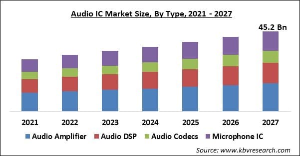 The Global Audio IC Market size is expected to reach $45.2 billion by 2027, rising at a market growth of 7.4% CAGR during the forecast period. Audio IC refers to a chip that performs function of an audio amplifier, audio processor, MEMS microphone, and subsystems. Audio DSPs, audio converters, audio amplifiers, and audio processors are some of the main types of audio ICs. Audio IC has considerable applications in professional audio, smart home, smart & portable gadgets and automotive audio. Some of the major catalysts for the development of the global market are the growing demand for smart home devices & the professional audio systems along with the requirement for compact & energy-efficient audio ICs.