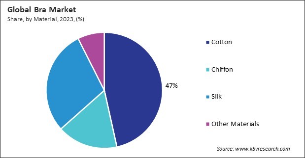 Based on material, the market is classified into cotton, chiffon, silk, and others. The silk segment procured 17% revenue share in the market in 2023. In terms of volume, 1,491.32 million units of silk bra are expected to be utilized by the year 2031. Silk bras attract consumers looking for elegance, softness, and a gentle feel against the skin, making them popular for special occasions or as luxury items. Silk’s natural sheen and lightweight properties offer a unique sensory experience, appealing to customers willing to invest in high-quality materials. As a result, the silk segment maintains a strong presence, driven by demand from consumers who prioritize sophistication and indulgence in their intimate wear.