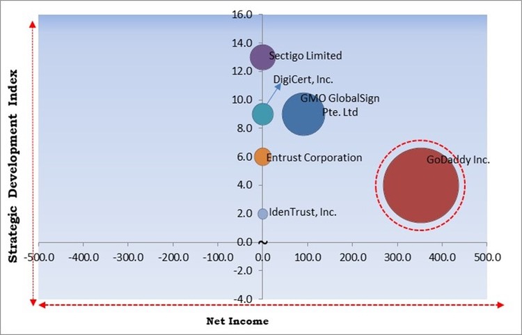 Based on the Analysis presented in the KBV Cardinal matrix; GoDaddy Inc. is the forerunner in the Market. Companies such as GMO GlobalSign Pte. Ltd, Sectigo Limited, DigiCert, Inc. are some of the key innovators in the Market. In March 2023, GlobalSign introduced a new service feature for its Automated Certificate Management Environment (ACME). The new service would benefit the users by saving their time by eliminating the need for manual Certificate Signing Requests (CSRs) filings.