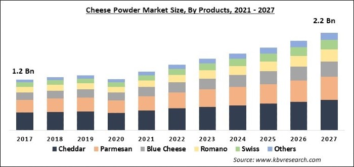 The Global Cheese Powder Market size is expected to reach $2.2 billion by 2027, rising at a market growth of 8.9% CAGR during the forecast period. The cheese powder offers nutritional values like high vitamins & proteins and low calories. These values are attracting consumer focus and are expected to surge the market of cheese products. In contrast, the increasing awareness about animal rights and environmental protection among consumers is shifting their preferences towards the vegan diet. These factors are responsible to hamper the growth of the cheese powder market during the forecast years.