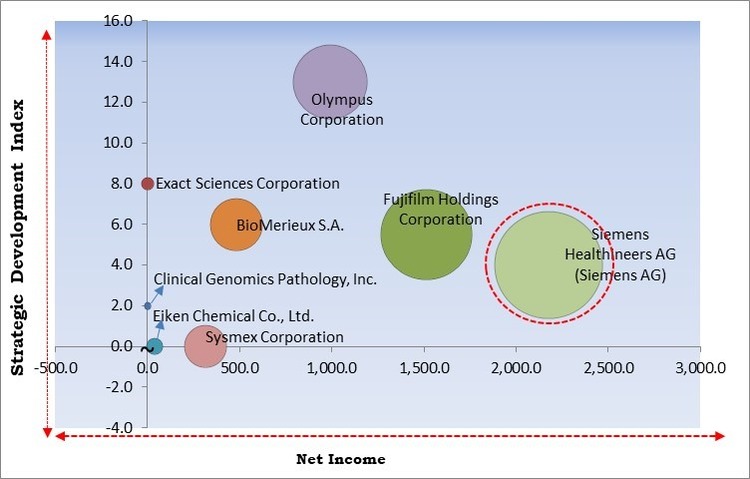 The market research report covers the analysis of key stake holders of the market. Key companies profiled in the report include Novigenix SA, Eiken Chemical Co., Ltd., Clinical Genomics Pathology, Inc., Exact Sciences Corporation, Epigenomics AG, BioMerieux S.A., Olympus Corporation, Sysmex Corporation, Fujifilm Holdings Corporation, and Siemens Healthineers AG (Siemens AG).