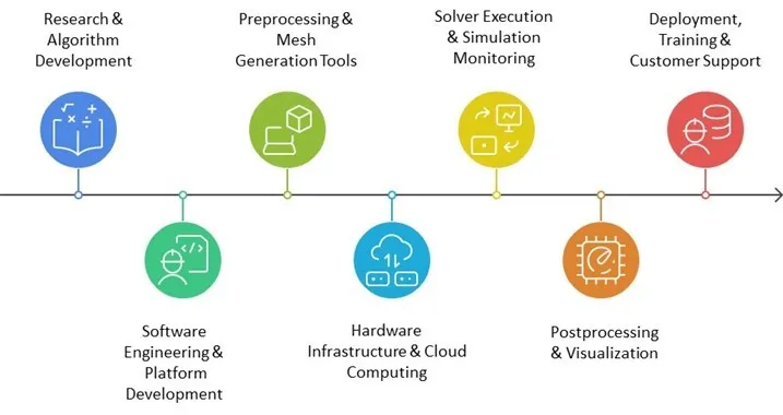The Computational Fluid Dynamics (CFD) Market value chain consists of several integrated stages. It begins with Research & Algorithm Development, where numerical models and simulation techniques are formulated. Next, Software Engineering & Platform Development ensures these models are coded into robust platforms. Preprocessing & Mesh Generation Tools handle geometry setup and mesh design. Simulations are run in Solver Execution & Simulation Monitoring. Post-analysis occurs in Postprocessing & Visualization, followed by Hardware Infrastructure & Cloud Computing support. Lastly, Deployment, Training & Customer Support ensures smooth end-user adoption and service continuity.
