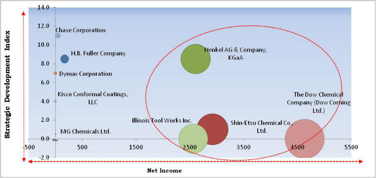 Based on the Analysis presented in the KBV Cardinal matrix; Shin-Etsu Chemical Co., Ltd., Illinois Tool Works, and Henkel AG & Company, KgaA are the forerunners in this Market. In February, 2024, Henkel AG & Company, KgaA unveiled Loctite Stycast CC 8555, a conformal coating designed to protect electronics in high-power applications like motor drives and EV charging. This solvent-free, UV and moisture-cure coating offers superior protection, excellent dielectric strength, and cost-effective processing, ensuring reliability in harsh environments while reducing environmental impact and energy costs. Companies such as The Dow Chemical Company, PPG Industries, Inc., and AkzoNobel N.V. are some of the key innovators in this Market.