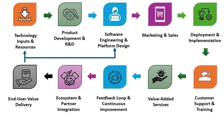 The value chain of this Market consists of ten key stages. It begins with Technology Inputs & Resources, followed by Product Development & R&D to innovate and build core capabilities. These feed into Software Engineering & Platform Design, which shapes the functionality and user interface. The software is then promoted through Marketing & Sales, and rolled out via Deployment & Implementation. Customer Support & Training ensures users adopt and use the software effectively, while Value-Added Services enhance the overall offering. A Feedback Loop & Continuous Improvement mechanism drives ongoing enhancements. Integration with external systems happens through Ecosystem & Partner Integration, culminating in End-User Value Delivery, where the software delivers measurable benefits to customers.