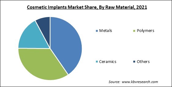 Based on Raw Material, the cosmetic implants market is fragmented into polymers, metals, ceramics, and others. The metals segment witnessed the largest revenue share in the cosmetic implants market in 2021. This is owing to the fact that these metallic materials are an excellent option for complete joint replacement because they possess several qualities, including high strength, high fracture toughness, hardness, corrosion resistance, and biocompatibility. The most common and crucial biomaterials used for joint replacement are metallic implants. These characteristics are expected to propel the segment's growth.