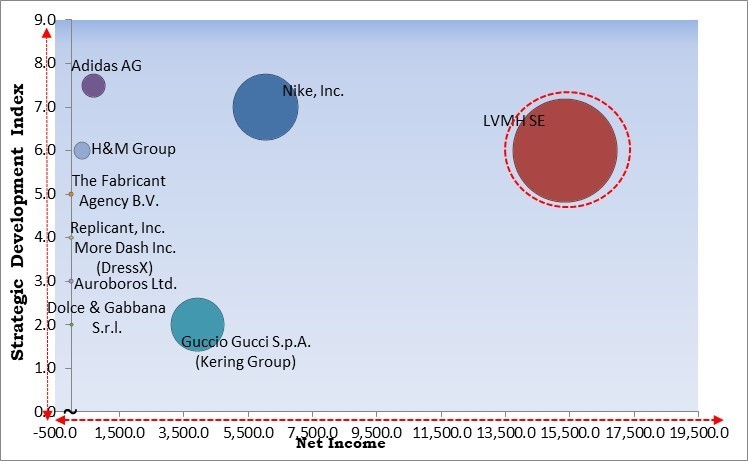 The major strategies followed by the market participants are Partnerships. Based on the Analysis presented in the Cardinal matrix; LVMH SE are the forerunners in the Digital Clothing Market. Companies such as Nike, Inc., Guccio Gucci S.p.A. (Kering Group), Adidas AG are some of the key innovators in Digital Clothing Market.