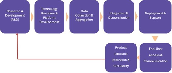 The value chain analysis depicted in the image outlines a systematic process from innovation to end-user engagement. It begins with Research & Development (R&D), laying the foundation for technological innovations. This progresses to Technology Providers & Platform Development, where tools and infrastructure are created. Next, Data Collection & Aggregation plays a critical role in gathering insights, which are then utilized during Integration & Customization to tailor solutions. Deployment & Support ensures the delivery and maintenance of the product. Following this, End-User Access & Communication facilitates user interaction and feedback. Finally, Product Lifecycle Extension & Circularity emphasizes sustainability and improvement, feeding insights back to R&D, completing a continuous innovation loop.
