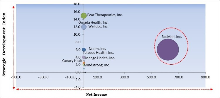 The major strategies followed by the market participants are Partnerships. Based on the Analysis presented in the Cardinal matrix; ResMed, Inc. is the major forerunner in the Digital Therapeutics Market. Companies such as Pear Therapeutics, Inc., Omada Health, Inc., and Noom, Inc., Mindstrong, Inc., Welldoc, Inc. are some of the key innovators in the market.