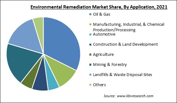 Based on the Application, the Environmental Remediation Market is bifurcated into Mining and Forestry, Oil & Gas, Agriculture, Automotive, Landfills, and Waste Disposal Sites, Manufacturing, Industrial, and Chemical Production/Processing, and Construction and Land Development. The mining and forestry segment witnessed a substantial revenue share in the environmental remediation market in 2021. Cleanup and restoration of sites comprising regions that were once accustomed mine coal or hard rock ore containing metals like gold or copper or other resources such as phosphorus face distinct problems.