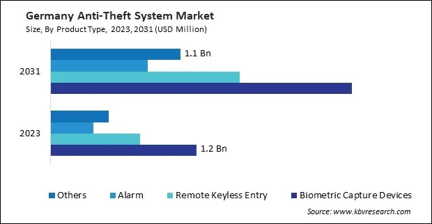 The Europe Anti-Theft System Market would witness market growth of 11.4% CAGR during the forecast period (2024-2031). The Germany market dominated the Europe Anti-Theft System Market by Country in 2023, and would continue to be a dominant market till 2031; thereby, achieving a market value of $6,001.5 million by 2031. The UK market is exhibiting a CAGR of 10.4% during (2024 - 2031). Additionally, The France market would experience a CAGR of 12.2% during (2024 - 2031).