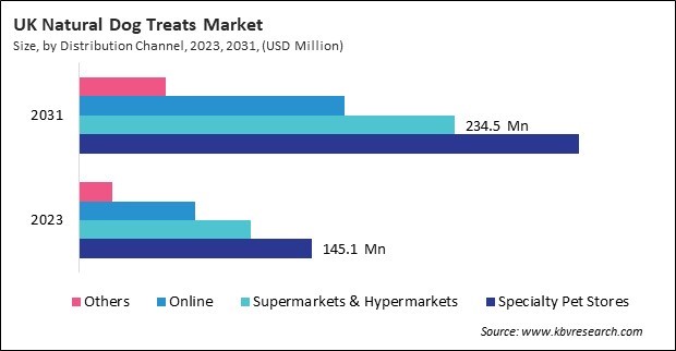 Likewise, the growing trend of "humanizing" pets has led to increased interest in natural dog treats that mirror trends in human health, such as organic, gluten-free, or non-GMO products. This alignment with human health trends supports adopting similar standards for pets. As consumers become more informed about the impact of ingredients on health, they seek natural dog treats that use high-quality, minimally processed components. This awareness encourages the adoption of treats with transparent ingredient lists and no artificial additives.