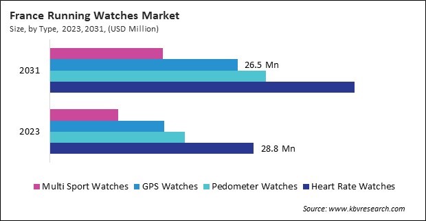 In France, the population's increasing health consciousness is a significant factor in the developing demand for running watches. The French government has actively promoted physical activity through various initiatives, including national fitness campaigns encouraging citizens to exercise regularly to combat sedentary lifestyles. According to the World Health Organization, 59.9% of adults (18-54 years of age) engage in some form of regular physical activity, with running being a preferred choice for many. The popularity of running events, such as marathons and local races, has also surged, creating a strong demand for fitness wearables. Running watches, which help track performance and provide personalized fitness data, have become essential tools for the health-conscious French population. Thus, as European consumers continue to invest in their health and fitness, the market for running watches is expected to maintain its growth trajectory in the coming years.