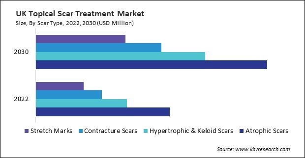 The Germany market dominated the Europe Topical Scar Treatment Market by Country in 2022 and would continue to be a dominant market till 2030; thereby, achieving a market value of $1,776 million by 2030. The UK market is exhibiting a CAGR of 7.9% during (2023 - 2030). Additionally, The France market would experience a CAGR of 9.8% during (2023 - 2030).
