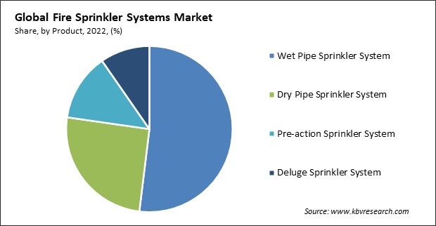 Based on component, the market is fragmented into product and services. In 2022, the product segment held the highest revenue share in the market. The increasing urbanization and construction endeavors worldwide, especially in emerging economies, have bolstered the need for fire sprinklers as modern buildings and infrastructure projects necessitate dependable fire protection measures. Technological advancements have played a significant role in creating more efficient and successful fire sprinkler systems, encompassing innovative designs, enhanced detection capabilities, and improved integration with fire alarm systems. These developments have further accelerated the global demand for these products.