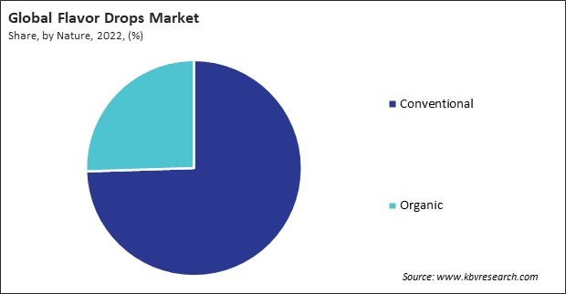 On the basis of nature, the market is segmented into organic and conventional. In 2022, the organic segment attained a 25% revenue share in the market. Growing consumer awareness and concern regarding health and wellness increases demand for organic and natural products. Consumers perceive organic drops as healthier alternatives to conventional ones, as they are made from organic ingredients free from synthetic pesticides, fertilizers, and genetically modified organisms (GMOs).