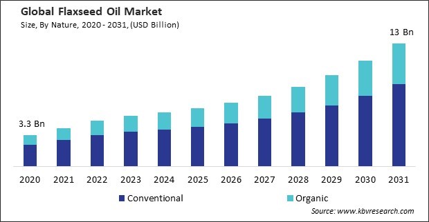 The Global Flaxseed Oil Market size is expected to reach $13 billion by 2031, rising at a market growth of 12.5% CAGR during the forecast period. In the year 2023, the market attained a volume of 220,418.9 tonnes, experiencing a growth of 14.8% (2020-2023).