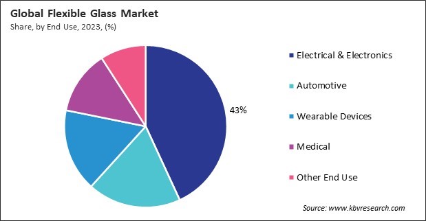 R&D investments address specific challenges, such as improving flexible glass's scratch resistance and thermal stability. These advancements make the material more suitable for high-performance environments, such as automotive infotainment systems and industrial IoT devices. Innovations are also driving the integration of flexible glass with other cutting-edge technologies, such as OLED displays and smart sensors, enabling the creation of next-generation products that cater to consumer and industrial demands. Additionally, the rising demand for flexible glass is also closely tied to manufacturers' ability to offer sleek, futuristic designs that stand out in the competitive consumer electronics industry. Flexible glass enables curved, edge-to-edge displays that enhance device aesthetics and functionality, aligning with consumer expectations for high-performance yet visually appealing products. Its ability to support innovative designs while maintaining durability and portability ensures that flexible glass will remain a cornerstone of this dynamic and rapidly evolving market. Hence, as the market continues to evolve, the role of flexible glass in meeting these consumer demands is expected to expand and the market is establishing a foundation for ongoing development as a result of the growing investment in research and development.