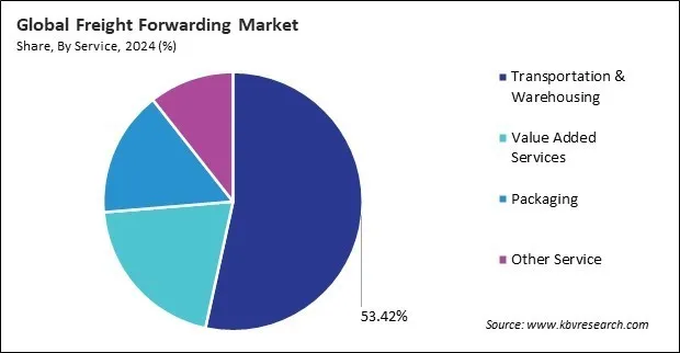 By service, the freight forwarding market is divided into transportation & warehousing, value added services, packaging, and service. The value added services segment garnered 20% revenue share in the freight forwarding market in 2024. Value added services in freight forwarding go beyond the basic transportation and storage offerings, enhancing the overall logistics experience for clients. These services may include customs brokerage, cargo insurance, documentation handling, tracking solutions, freight consolidation, and reverse logistics.