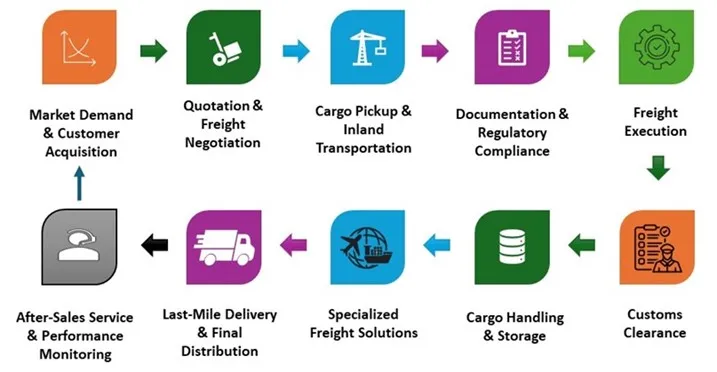 The value chain of the Freight Forwarding Market starts with Market Demand & Customer Acquisition, identifying client needs and generating business. It proceeds with Quotation & Freight Negotiation to finalize costs, followed by Cargo Pickup & Inland Transportation for goods collection. Documentation & Regulatory Compliance ensures legal and procedural adherence, leading to Freight Execution. After Customs Clearance, goods undergo Cargo Handling & Storage, and Specialized Freight Solutions optimize transport. The process concludes with Last-Mile Delivery & Final Distribution, supported by After-Sales Service & Performance Monitoring, fostering customer satisfaction and continuous improvement.