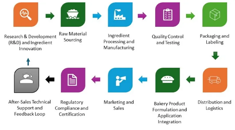 The above image shows the value chain analysis of the market, highlighting the key stages from concept to customer. It starts with Research & Development (R&D) and ingredient innovation, where new functional ingredients are created. Further, raw materials are sourced, followed by ingredient processing and manufacturing to manufacturing high-quality components. Meticulous quality control and testing ensures safety and standards before packaging and labeling make the products market ready. The chain continues with distribution and logistics, bakery product formulation and application integration, and then marketing and sales to reach consumers. Finally, regulatory compliance, certification, and an after-sales feedback loop close the cycle, driving improvements and further innovation.