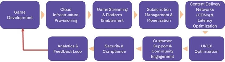 The Gaming as a Service (GaaS) value chain starts with Game Development, where engaging content is created. This is followed by Cloud Infrastructure Provisioning, ensuring scalable server resources for global access. Game Streaming & Platform Enablement allows users to play on-demand across devices, while Subscription Management & Monetization handles billing and user access.To deliver a seamless experience, CDNs and Latency Optimization minimize delays. UI/UX Optimization refines player interaction, and Customer Support & Community Engagement fosters loyalty. Security & Compliance safeguard data and platform integrity, and The cycle ends with an Analytics & Feedback Loop informs future development, closing the value chain with continuous improvement.