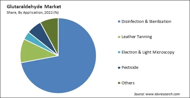 On the basis of product, the market is segmented into glutaraldehyde 25%, glutaraldehyde 50%, and others. The product is effective against various microorganisms and is used in various applications, including sterilization of healthcare equipment, leather fixatives, and chemical intermediates. It is the most commonly used cross-linking agent in processes requiring enhanced material strength and durability. Many companies produce 50% glutaraldehyde for various applications such as medical device disinfection and biocide in the oil field. The microbial solution containing 50% C5H8O2 removes bacteria for increasing operational efficiency in EOR (enhanced oil recovery) and water flooding applications.