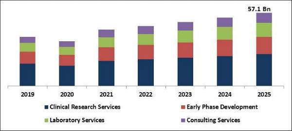 The Global Healthcare CRO Services Market size is expected to reach $57.1 billion by 2025, rising at a market growth of 6.8% CAGR during the forecast period. Contract research organizations (CRO) are the companies that provide contract-based research services to several pharmaceutical & biotechnology industries, medical devices industries, and various government research organizations. Such facilities include research and development of medicines & devices, i.e. pre-discovery, CMS, preclinical research, clinical trials, post-marketing monitoring, and laboratory facilities.