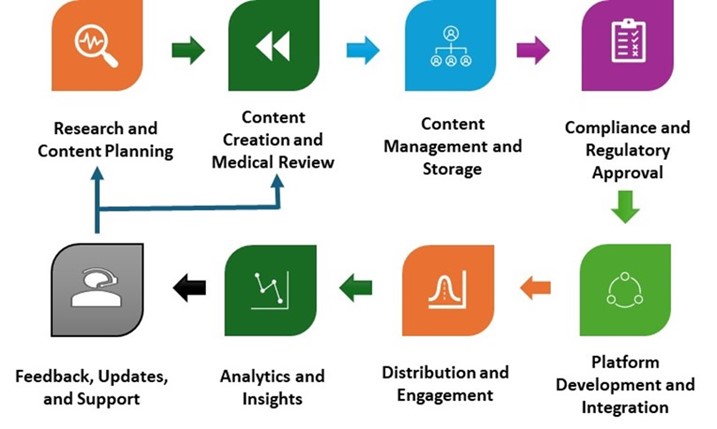 The value chain analysis of the Healthcare Digital Content Creation Market, as shown in the image, outlines a comprehensive and cyclical process. It begins with Research and Content Planning, followed by Content Creation and Medical Review to ensure accuracy and relevance. This content is then organized through Content Management and Storage and moves on to Compliance and Regulatory Approval to meet healthcare standards. After approval, Platform Development and Integration ensures seamless delivery across digital channels. The next stages, Distribution and Engagement and Analytics and Insights, focus on audience interaction and performance measurement. Finally, Feedback, Updates, and Support enable continuous improvement and feed insights back into planning, completing the loop.