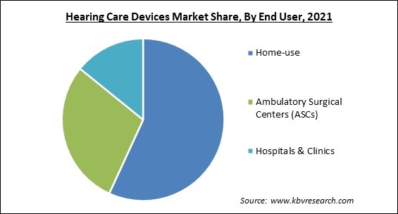 Based on End User, the market is segmented into Home-use, Ambulatory Surgical Centers (ASCs), and Hospitals & Clinics. The ambulatory surgical centres segment garnered a significant revenue share in the hearing care devices market in 2021, due to an increase in outpatient surgeries which does not need a hospital stay. The availability of ambulatory surgery centres is assisting in the transformation of healthcare facilities and the medical equipment sector. The increasing number of ASCs in emerging nations is likely to boost the market's growth. Moreover, increased use of ophthalmic treatment in these settings is likely to contribute to the market growth due to lower costs & shorter wait times. Furthermore, the growth is bolstered by the fact that therapy is offered quickly in customized settings.