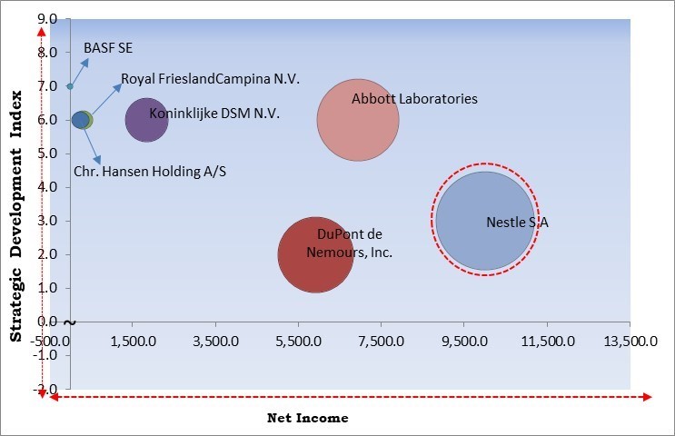 Based on the Analysis presented in the KBV Cardinal matrix; Nestle S.A is the forerunner in the Market. Companies such as Abbott Laboratories, DuPont de Nemours, Inc. and Koninklijke DSM N.V. are some of the key innovators in Market. In February, 2019, DuPont de Nemours, Inc. signed a partnership with Lonza, a Swiss pharmaceutical company, to develop and commercialize its CARE4U 2'-FL, a human milk oligosaccharide. The partnership comes in line with DuPont's business growth strategy.