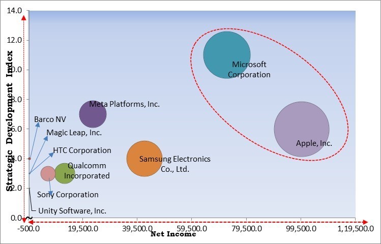 Based on the Analysis presented in the KBV Cardinal matrix; Apple, Inc. and Microsoft Corporation are the forerunners in the Market. In October, 2022, Microsoft Corporation came into partnership with Meta, an American technology company, to provide immersive VR experiences. The partnership involves the integration of Microsoft's Mesh for Teams with Meta Quest Pro devices and would lead to enhanced collaboration between different people. Companies such as Samsung Electronics Co., Ltd., Meta Platforms, Inc. and Qualcomm Incorporated are some of the key innovators in the Market.