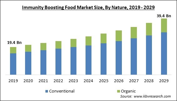 The Conventional market acquired maximum share in Global Immunity Boosting Food Market by Nature in 2022; thereby, achieving a market value of $29.7 billion by 2029.