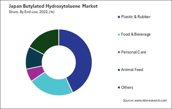 Plastics and rubber products in the automotive, electronics, and machinery industries require high durability and performance. BHT plays a crucial role in maintaining these qualities by preventing degradation due to exposure to heat, light, and oxygen, thus extending the lifespan of the end products. As demand for high-quality finished goods grows, so does the need for additives like BHT to maintain product integrity. Thus, BHT's role in enhancing the stability, durability, and environmental performance of plastics and rubber makes it a key component in meeting the evolving needs of Japan's manufacturing industries.