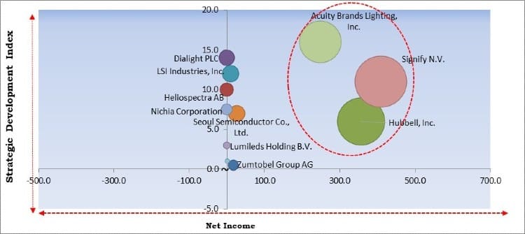The major strategies followed by the market participants are Product Launches. Based on the Analysis presented in the Cardinal matrix; Acuity Brands Lighting, Inc., Signify N.V., and Hubbell, Inc. are the major forerunner in the LED Lighting Market. Companies such as Dialight PLC, LSI Industries, Inc., and Nichia Corporation are some of the key innovators in the market.