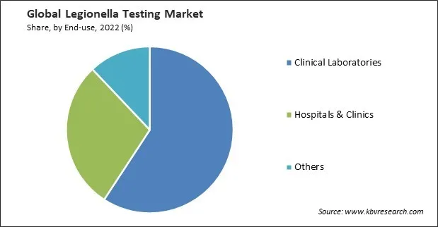 On the basis of end-user, the market is classified into hospitals & clinics, clinical laboratories, and others. In 2022, the hospital & clinics segment recorded a considerable revenue share in the market. In light of the potential for severe respiratory ailments caused by Legionella bacteria, routine testing is implemented by healthcare facilities to ascertain the absence of contamination in their water systems. Furthermore, medical facilities such as hospitals and clinics accommodate patients who are recovering from underlying health conditions, the elderly, or those who are enduring medical treatments. Healthcare facilities perform routine water system testing to ensure these populations' safety due to their heightened susceptibility to infections.