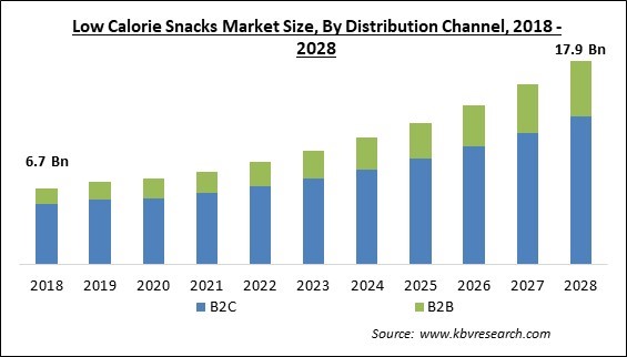 By distribution channel, the low-calorie snacks market is classified into B2B and B2C. The B2C segment witnessed the largest revenue share in the low-calorie snacks market in 2021. This is because these channels offer a variety of products and frequently serve as a one-stop shop for all daily needs. The urban and semi-urban populous prefers B2C due to the items' accessibility. One of the developments in the low-calorie snack industry is a rise in the number of outlets operated by major companies.