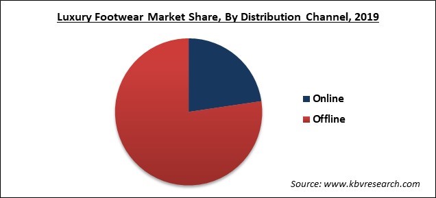 Based on Distribution Channel, the market is segmented into Online and Offline. Offline distribution channels led the market and have a significant share of the global revenue in the year 2019. Brick and mortar stores counting independent luxury footwear stores and boutique shops are popular among consumers. These stores are rapid to adapt to the fashion styles in the luxury products market and be disposed to offer special deals to their customers, thus boosting the sale growth. Multi-brand luxury footwear stores are amongst other prevalent distribution channels.