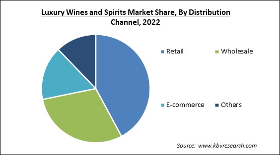 Based on distribution channel, the luxury wines and spirits market is bifurcated into wholesale, retail, e-commerce, and others. In 2022, the retail segment witnessed the largest revenue share in the luxury wines and spirits market. Increased adoption of retail stores in both developed and developing economies might be linked to the growth of the retail segment in the luxury wine and spirits market. Additionally, these retail formats offer a one-stop shop, making them a popular choice with customers.