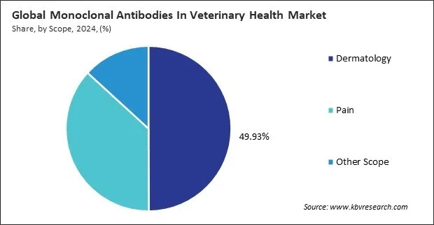 On the basis of scope, the monoclonal antibodies in veterinary health market is classified into dermatology, pain, and others. The pain segment recorded 37% revenue share in the monoclonal antibodies in veterinary health market in 2024. The pain segment plays a vital role in the veterinary monoclonal antibodies space, focusing on the management of chronic and acute pain, especially in conditions like osteoarthritis. Monoclonal antibodies designed for pain relief work by targeting nerve growth factors or other pain-related pathways, providing sustained and non-opioid-based solutions for animal discomfort.