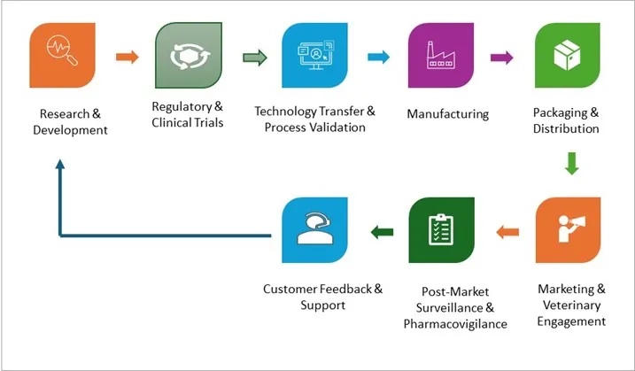 The value chain of the Monoclonal Antibodies in Veterinary Health Market begins with Research & Development, focusing on scientific innovation to create effective antibody therapies. This is followed by Regulatory & Clinical Trials, ensuring safety, efficacy, and compliance. The Technology Transfer & Process Validation phase establishes scalable, quality-assured production processes, leading to Manufacturing of the final products. Afterward, Packaging & Distribution ensures safe delivery to markets. Marketing & Veterinary Engagement promotes awareness among veterinarians and end-users. Post-launch, Post-Market Surveillance & Pharmacovigilance monitor safety, while Customer Feedback & Support provide valuable insights to drive future improvements and innovation.