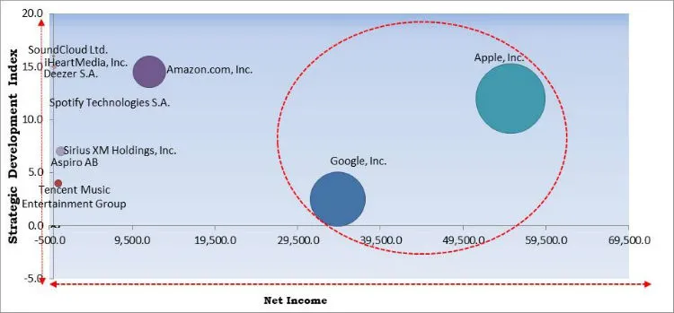The major strategies followed by the market participants are Product Launches and Partnerships. Based on the Analysis presented in the Cardinal matrix; Google, Inc. and Apple, Inc. are the forerunners in the Music Streaming Market. Companies such as SoundCloud Ltd., Amazon.com, Inc., iHeartMedia, Inc., Deezer S.A., Spotify Technologies S.A., Sirius XM Holdings, Inc., Aspiro AB, and Tencent Music Entertainment Group are some of the key innovators in the market.