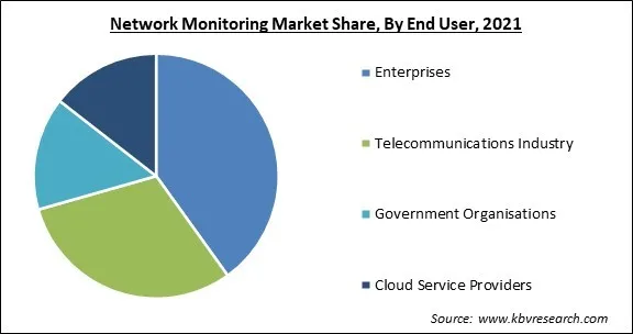 Based on end-user, the network monitoring market is fragmented into Enterprises, Telecommunication Industry, Government Organizations and Cloud Service Providers. In 2021, the telecommunication industry segment registered a significant revenue share of the network monitoring market. One of the main factors propelling the growth of the network monitoring market is the significant growth of the telecommunications sector. The demand for comprehensive visibility of network infrastructure is fueling the expansion of the industry.