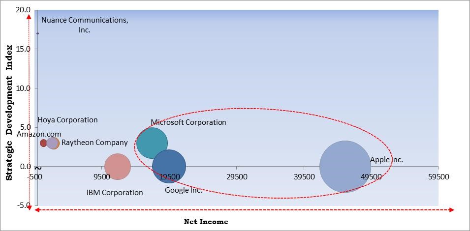 Based on the Analysis presented in the Cardinal matrix, Google Inc., Microsoft Corporation and Apple Inc. are the forerunners in the Voice Recognition market. Companies such Nuance Communications, Inc., Hoya Corporation, Amazon.com and Raytheon Company are the some of the key innovators in Voice Recognition Market.
