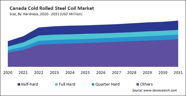 The North America Cold Rolled Steel Coil Market would witness market growth of 2.7% CAGR during the forecast period (2024-2031). In the year 2020, the North America market's volume surged to 18,494.62 tonnes, showcasing a growth of 22% (2020-2023). Half-Hard cold rolled steel coils exhibit moderate hardness, typically achieved through partial annealing, making them less malleable than fully annealed (soft) steel but more workable than full-hard steel. Thus, the Canada market would utilize 1,410.97 tonnes of Half-Hard cold rolled steel coils by 2031.