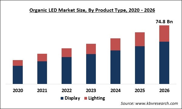 The Global Organic LED Market size is expected to reach $74.8 billion by 2026, rising at a market growth of 16% CAGR during the forecast period. OLEDs are designed to develop displays used in devices like computer & television screens, consoles, smartphones, and others. The simple usability and high comfort are making OLED highly popular in the electronics industry. OLED market has witnessed a massive investment due to the fact that OLED displays provide superior Image quality and allow future foldable and roll-able displays. Its properties like extra thin, self-emission and lightweight are paving the way for OLED technology. They are also utilized in the automobile industry to develop back-window alerts, rear-view mirrors, and dashboard displays. OLEDs are costlier in comparison to LED and LCD products, which could hamper the growth of the market in the next few years.