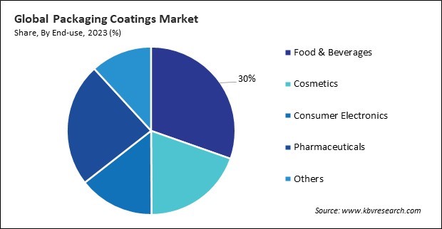 Based on end-use, the market is divided into food & beverages, cosmetics, pharmaceuticals, consumer electronics, and others. In 2023, the cosmetics segment witnessed a 19.5% revenue share in the market. In terms of volume, the segment attained 266.8 kilo tonnes in 2023. These coatings play a crucial role in elevating the aesthetics of cosmetic packaging, enhancing the tactile feel, visual impact, and perceived value of beauty and personal care products.